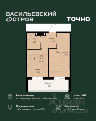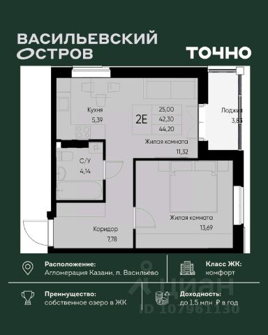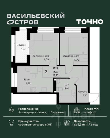 ЖК "Васильевский остров" — масштабный проект ТОЧНО в Казанской агломерации. Просторная территория 88 Га спроектирована для комфортной жизни: озеро с набережной и пляжем, каток, зелёные маршруты. В проекте комплекса — школа на 1 224 места, 2 детских сада на 680 мест, детская и взрослая поликлиники, фитнес-центр с бассейном, термальный комплекс, фермерский рынок, магазины, кафе и рестораны.