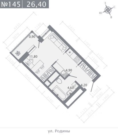 Продаётся студия в строящемся доме (Корпус 1), срок сдачи: II-кв. 2028, общей площадью 26.4 кв.м., на 14 этаже.