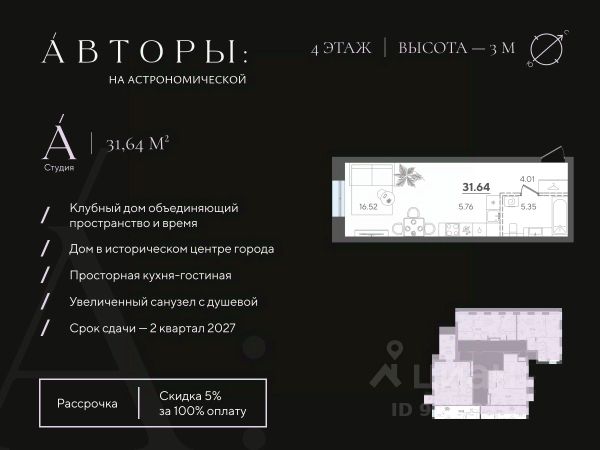 Вы можете приобрести эту квартиру в рассрочку с первоначальным взносом 30%. Подробнее - звоните! Продается студия 8 в клубном доме "Авторы на Астрономической" в центре Казани, в шаге от канала Булак. Квартира на 2 этаже площадью 31,66 м², высотой потолков 3 м. Квартира сдается в свободной планировке, предоставляя полную свободу для ваших предпочтений в дизайне и возможность подстроить пространство под ваши жизненные ценности. Срок сдачи дома — 2-й квартал 2027 года. В клубном доме всего 25 квартир от 31м² до 117м². Возможно приобретение со скидкой 5% при полной оплате. Клубный дом "Авторы на Астрономической" в историческом центре Казани, в пешей доступности от Кремля и главных достопримечательностей города. Вы находитесь в самом центре: можно выйти из дома и быстро добраться в любую часть города, даже в час пик. В соответствии с современными стандартами бизнес-класса "Авторы" предлагают особые решения для вашего комфорта: • Тактильная натуральная архитектура из ригельного кирпича ручной формовки. • Закрытая территория с круглосуточным видеонаблюдением. • Трехсекционный двор с высокорослыми растениями и озеленением по философии Хаяо Миядзаки. • Подземный паркинг с умным въездом (распознавание госномеров). • Астро-лобби с круглосуточным консьержем, зонами отдыха и дизайнерской отделкой из натуральных коллекционных материалов для создания атмосферы высокого класса. Особенным пространством в доме станет арт-зал с проекцией 360, которая предоставляет жителям дома возможность быть свидетелями произведений диджитал-художников, а также организовывать просмотры фильмов в формате приватного кинотеатра не выходя из дома. Компания "Авторы" — девелопер на рынке высококлассной недвижимости Казани. Как самостоятельный застройщик компания работает с 2022 года. В портфеле компании один сданный проект, пять клубных домов на этапе строительства и еще три в разработке. Компания входит в ТОП-5 застройщиков ЕРЗ** РТ по потребительским качествам. Сейчас компания ведет строительство проектов на ул. Большая, ул. Петербургская, ул. Годовикова и ул. Астрономическая.