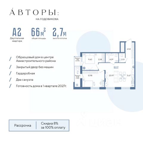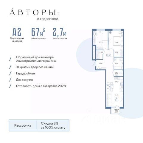 Вы можете приобрести эту квартиру в ипотеку с первоначальным взносом от 2,3 млн рублей и ежемесячным платежом от 23.000 рублей (ипотека для всех) или от 75 тыс. рублей (семейная ипотека) Подробнее - звоните! Продается 1-к квартира 129 в образцовом доме "Авторы на Годовикова" в центре Авиастроительного района. Квартира на 8 этаже площадью 45.63 м², кухней-гостиной и высотой потолков 2.7 м. Квартира сдается в предчистовой отделке со стяжкой полов, предоставляя полную свободу для ваших предпочтений в дизайне. Срок сдачи дома — 1-й квартал 2027 года. Возможно приобретение со скидкой 8% при полной оплате(акция действительная до 31.07.2026г.), в рассрочку с первым взносом 30%, а также оформление стандартной ипотеки по интересным условиям. Образцовый дом "Авторы на Годовикова" расположен в тихой зоне, удаленной от активной дороги — на второй линии от улицы Максимова. Соседство с невысокими частными домами открывает превосходный вид из квартиры. Для прогулок на свежем воздухе в шаговой доступности Караваевский парк и парк "Крылья Советов". В соответствии с современными стандартами комфорт-класса "Авторы" предлагают особые решения для вашего комфорта: • Современная архитектура. • Закрытый двор без машин. • Дизайнерские холлы с зонами ожидания и детской комнатой. • Подземный паркинг. • Зона для хвостатых. Двор в концепции траектории полета создает единую линию движения. На территории дома есть многофункциональная зона для йоги и настольных игр, детская зона для комфортных прогулок юных жителей, многофункциональная спортивная площадка со скалолазанием и площадка для выгула собак. Обильное озеленение из 25 видов растений и несколько игровых зон для юных жителей разных возратов: для детей до 3-х лет — песочница, горка и качели; для детей от 4 до 14 лет — большой игровой комплекс, включающий горки, качели, карусели, переговорные трубы и мягкую геопластику, в которой прячутся тоннели. Компания "Авторы" — девелопер на рынке высококлассной недвижимости Казани. Как самостоятельный застройщик компания работает с 2022 года, а в начале 2024 года успешно сдали свой первый проект ЖК "Дом у озера", где 96% квартир были приняты дольщиками с первого раза и без критичных замечаний. Компания входит в ТОП-5 застройщиков РТ по потребительским качествам ЕРЗ. Сейчас компания ведет строительство проектов на ул. Большая, ул. Петербургская, ул. Годовикова и ул. Астрономическая Купить квартиру в районе Авиастроительный в городе Казань.