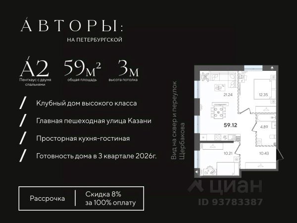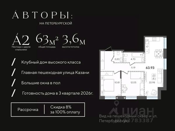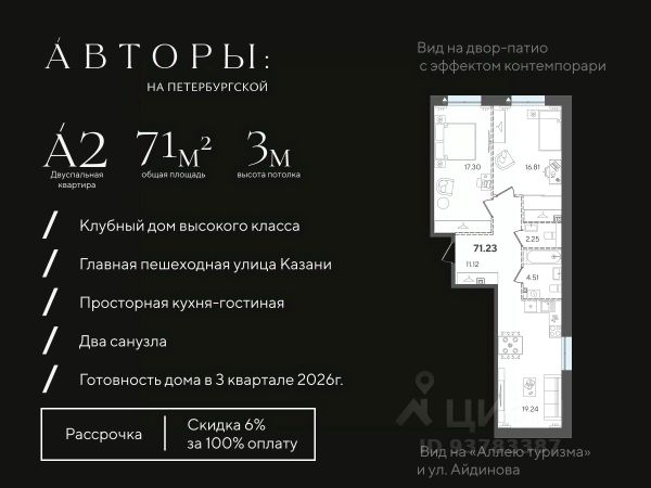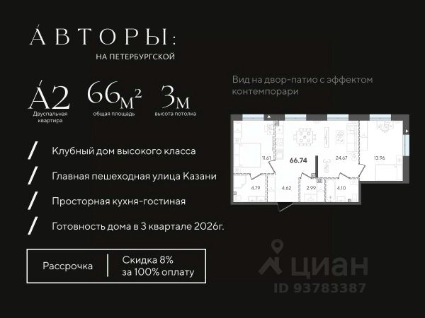 Вы можете приобрести эту квартиру в рассрочку с первоначальным взносом 20% и ежемесячным платежом 150 000 рублей. Подробнее - звоните! Продается 1-к квартира 24 в клубном доме "Авторы на Петербургской" на главной пешеходной улице Казани. Квартира на 2 этаже площадью 40,04 м², высотой потолков 3 м. Квартира сдается в свободной планировке, предоставляя полную свободу для ваших предпочтений в дизайне и возможность подстроить пространство под ваши жизненные ценности. Срок сдачи дома — 3-й квартал 2026 года. В клубном доме всего 68 квартир, включая 18 эксклюзивных пентхаусов. Возможно приобретение с полной оплатой (при полной оплате скидка 8%), в рассрочку с первым взносом 20%, 30% или 50% ( при приобретении в рассрочку с первым взносом 50% возможна скидка до 6% от стоимости), а также оформление ипотеки. Клубный дом "Авторы на Петербургской" расположен на главной пешеходной улице Казани в 3-х минутах до набережной озера "Нижний Кабан". Вы находитесь в самом центре: можно выйти из дома и быстро добраться в любую часть города, даже в час пик. В соответствии с современными стандартами бизнес-класса "Авторы" предлагают особые решения для вашего комфорта: • Закрытая территория с круглосуточным видеонаблюдением. • Подземный паркинг с электрозаправками, келлеры для хранения, умный въезд с распознаванием номеров. • Натуральные коллекционные материалы в лобби для создания атмосферы премиум-класса. Двор-патио с эффектом контепорари наполняет территорию дома тишиной и эстетикой, где каждый элемент выглядит как арт-объект, превращая двор в музей современного искусства. Также в пространстве дома есть детская зона — шалаш, где юные жители смогут придумать сотню новых игр с друзьями, а взрослые будут уверены в их безопасности. Компания "Авторы" — девелопер на рынке высококлассной недвижимости Казани. Как самостоятельный застройщик компания работает с 2022 года, а в начале 2024 года успешно сдали свой первый проект ЖК "Дом у озера", где 96% квартир были приняты дольщиками с первого раза и без критичных замечаний. Компания входит в ТОП-5 застройщиков РТ по потребительским качествам ЕРЗ. Сейчас компания ведет строительство проектов на ул. Большая, ул. Петербургская, ул. Годовикова и ул. Астрономическая Квартира в микрорайоне Суконная слобода в городе Казань.