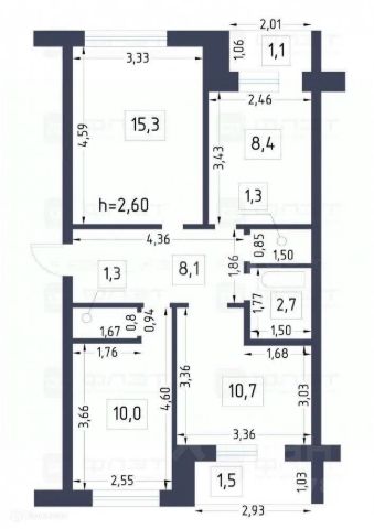 Общая площадь — 52,5 м²