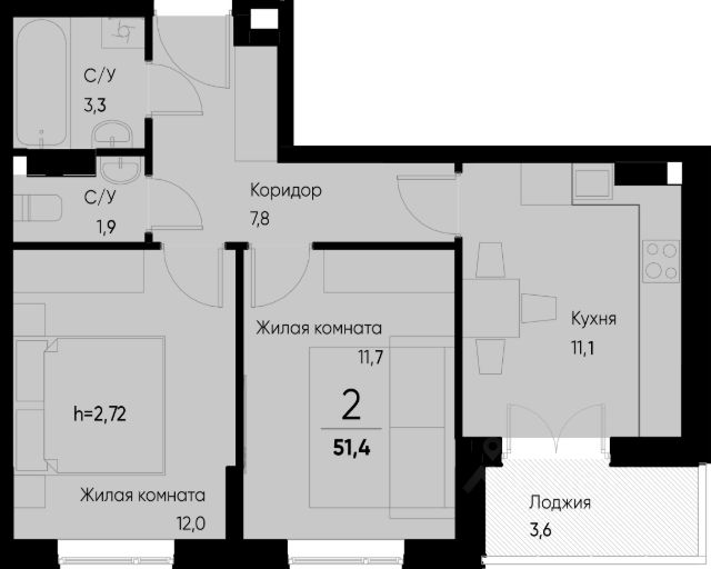 Нижний уровень: Кухня, санузел (туалет + ванная), прихожая и гостиная (третья комната).