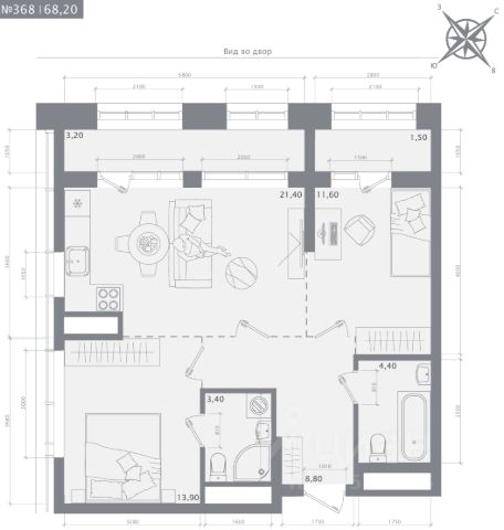 Продаётся 2-комнатная квартира в строящемся доме (Дом 2), срок сдачи: IV-кв. 2027, общей площадью 68.2 кв.м., на 3 этаже.