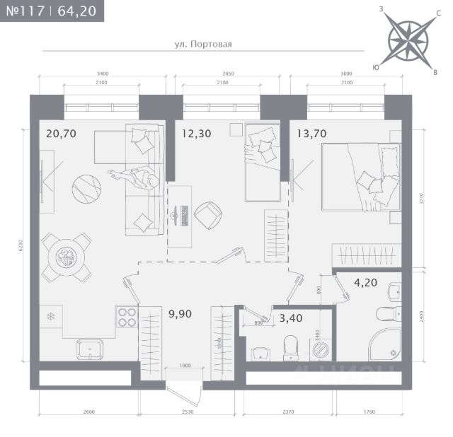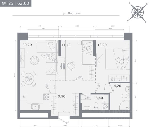 Продаётся 2-комнатная квартира в строящемся доме (Дом 2), срок сдачи: IV-кв. 2027, общей площадью 59.7 кв.м., на 12 этаже.