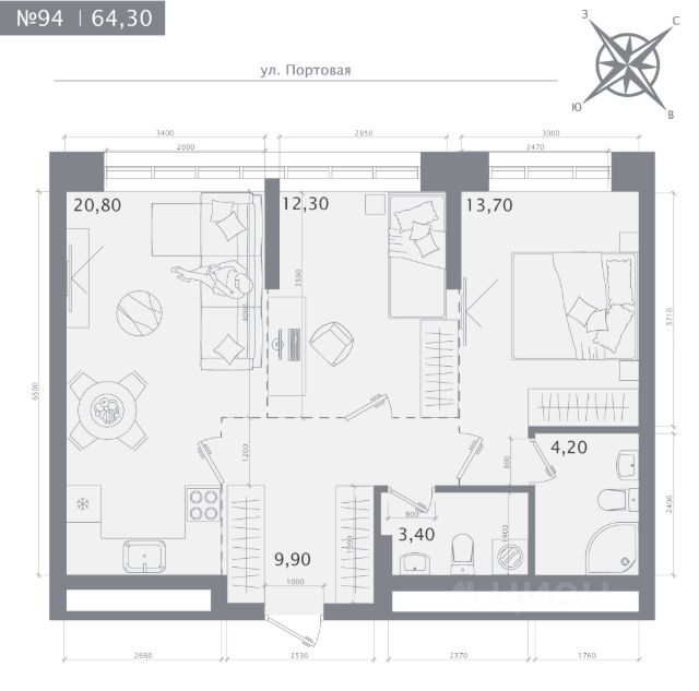 Продаётся 2-комнатная квартира в строящемся доме (Дом 1), срок сдачи: IV-кв. 2027, общей площадью 69.4 кв.м., на 6 этаже.