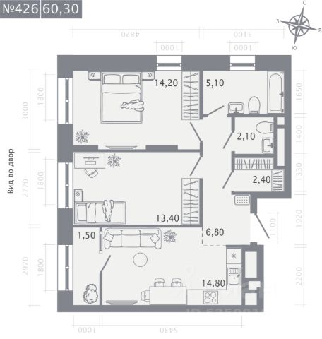 Продаётся 2-комнатная квартира в строящемся доме (Корпус 2), срок сдачи: I-кв. 2029, общей площадью 60.3 кв.м., на 3 этаже.