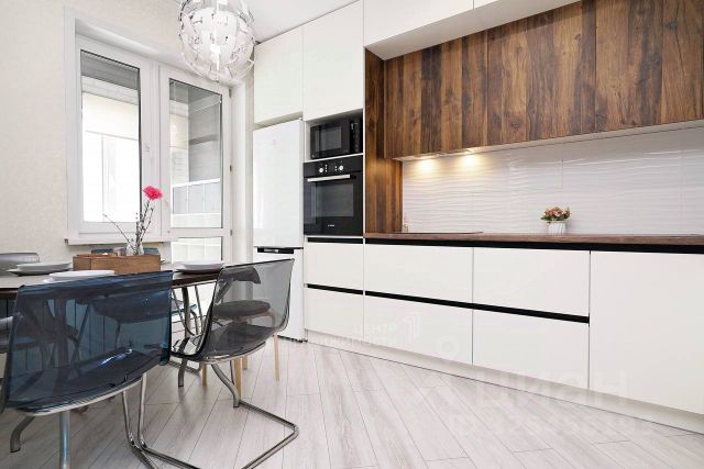 Большая комната правильной формы площадью 16,8 кв м, просторная кухня - 13,5 кв м со встроенной мебелью из МДФ и встроенной техникой.
