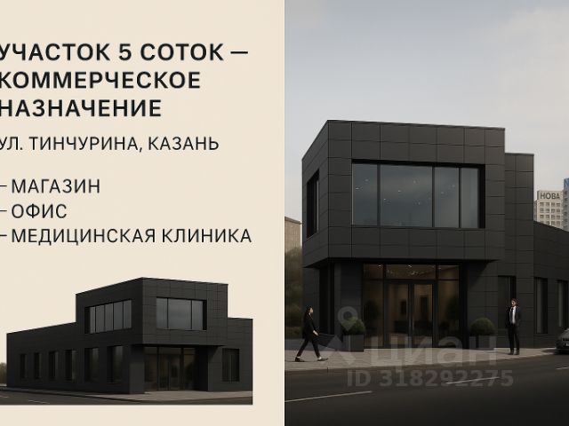 Коммерческий участок в центре Казани Объект: Участок площадью 5 соток по адресу: ул. Тинчурина, д. 7, Вахитовский район, г. Казань. Идеально подойдёт для коммерческой застройки — магазин, офисное здание или медицинская клиника. Основные характеристики: - Площадь участка: 500 м² - Категория земли: ж-4, магазины шаговой доступности - Разрешённая этажность: до 2 этажей - Первая линия, высокий пешеходный трафик - Все центральные коммуникации рядом Модели использования: 1. Магазин шаговой доступности с офисами (2 этажа) 2. Частная медицинская клиника или стоматология 3. Офисное здание на 12 арендатора 4. Представительство компании или шоурум Возможна разработка и передача архитектурной концепции в рамках сделки. Преимущества: - Центр города - Угловой участок, отличная визуализация - Подходит под любой вид коммерции - Возможность быстро начать строительство - Перспектива высокой капитализации вложений