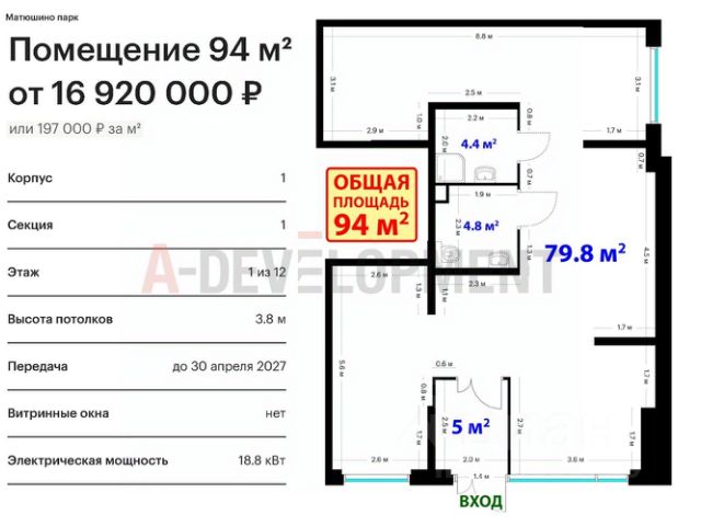Коммерческое помещение в ЖК Матюшино парк Корпус 1 Секция 1 Этаж 1 из 12 Площадь - 94 кв.м. Стоимость объекта - 16 920 000 Цена за кв.м - 180 000 Первая линия, на трафике. Отдельный вход. Высота потолков - 3.8 м. Витринные окна. Электрическая мощность - 18.8 кВт...