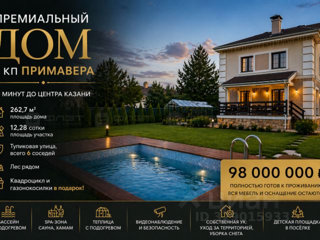 Новый дом с дизайнерским ремонтом в премиальном коттеджном посёлке Примавера Просторный, светлый дом площадью 264 м² расположен на видовом участке 10 соток. Роскошный интерьер в современном экостиле дополнен премиальной итальянской мебелью. Отделка выполнена из натуральных дорогих материалов: инженерная доска, керамогранит итальянских и испанских производителей, двери из натурального шпона. Отделка интерьера натуральным массивом дуба . Благодаря удачному расположению в поселке, вокруг идеальная тишина, огромная парковочная зона. На участке более 40 хвойных деревьев: голубые ели, горные сосны. В доме грамотная правильная планировка для комфортной жизни: - 1 этаж: гостиная, кухня со всей необходимой техникой лучших производителей, столовая, каминная зона, гостевой санузел, большой гардероб с отдельной постирочной комнатой, из гостиной выход на террасу откуда открывается вид на сад - 2 этаж: мастер спальня с просторной ванной комнатой, где удобно продумано все до мелочей, вся сантехника известных производителей, гостевая спальня, кабинет. -цокольный этаж: SPA зона с сауной, санузел+душевая, мини-кухня, фитнес зона, бар-зона отдыха, котельная, дополнительный выход из цоколя на улицу. В доме система кондиционирования, видеонаблюдение. Элитный коттеджный поселок Примавера имеет очень выгодное месторасположение всего в 10 минут езды от Кремля, что позволяет совмещать загородную жизнь с трудовыми буднями. Строго охраняется и патрулируется 24 часа. На территории не бывает посторонних благодаря КПП на въезде и круглосуточному наблюдению. Управляющая компания следит за состоянием коммуникаций, решает технические вопросы жильцов, стрижет газоны, поддерживает чистоту и порядок в поселке. Подробности по телефону. Загородная недвижимость на улице Виктора Деринга в городе Казань.