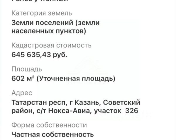 Продается земельный участок с возможностью подключения газа Расположение и доступность: Участок находится всего в 4 минутах от Ленты, что обеспечивает удобный доступ к магазинам и услугам. Есть возможность выезда на улицу Кул Гали, минуя пробки на Салмачинской, через улицы Рябиновая и Приречная. Характеристики участка: Площадь участка составляет 623 м², ровный и ухоженный. Кадастровый номер смотрите на фотографиях. Фото реальные с Кадастровой карты. Плодовые деревья: На участке растут плодоносящие груша и слива, добавляя экологическую ценность и давая возможность наслаждаться свежими фруктами. Удобства и инфраструктура: Установлен электросчетчик и освещение по аллее 2025 году. Местоположение участка очень удачное: он находится на ровной стороне, у центральной аллеи, что обеспечивает уединение и комфортное проживание. Вокруг много домов, где жильцы проживают круглогодично, а зимой центральная дорога регулярно очищается от снега. Правовой статус: Участок принадлежит одному взрослому собственнику и не имеет долгов и обременений, что делает процесс покупки простым и безопасным. Не упустите шанс стать владельцем этого привлекательного участка! Арт. 125329047