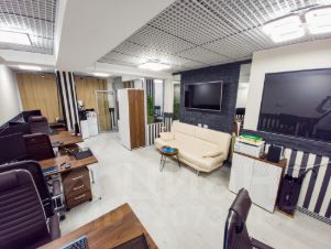 Раздельные зоны рабочая зона сотрудников и комфортная зона отдыха.