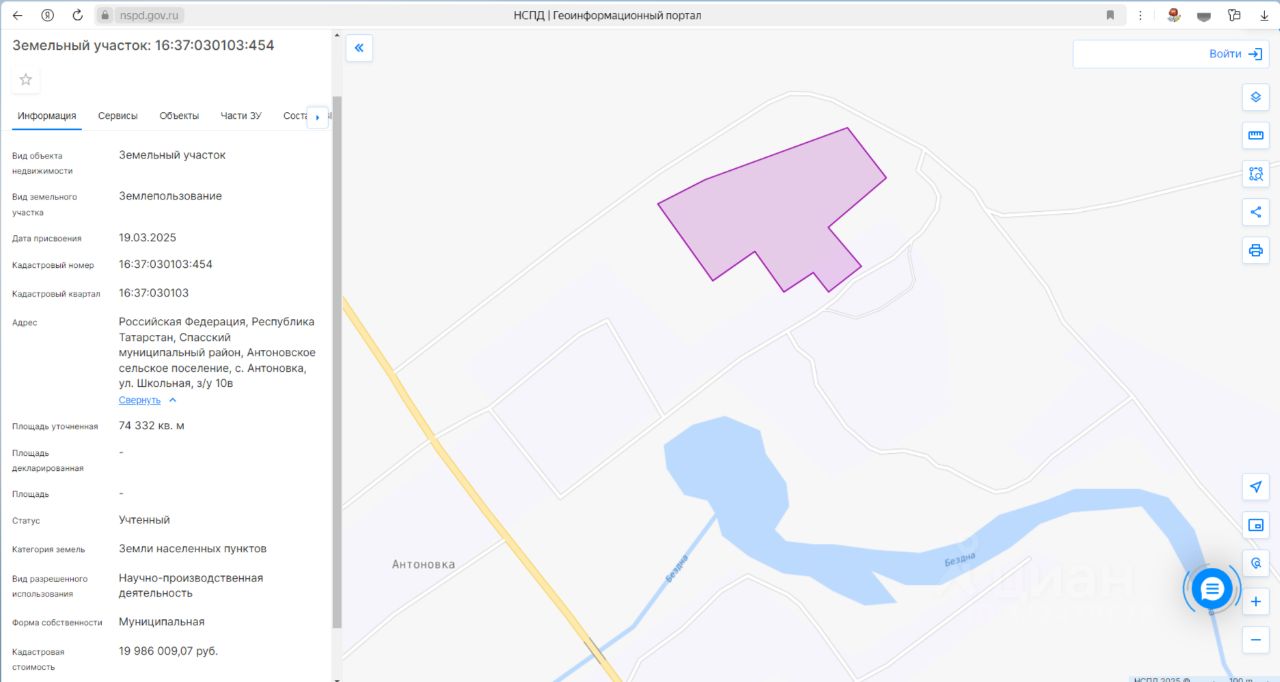 Земельный участок, категория земель: Земли населенных пунктов, разрешенное использование: Научно-производственная деятельность, Описание вида разрешенного использования земельного участка: Размещение технологических, промышленных, агропромышленных парков, бизнес-инкубаторов, общая площадь 74332+/-95 кв.м, кадастровый номер 16:37:030103:454, расположенный по адресу: Российская Федерация, Республика Татарстан, Спасский муниципальный район, Антоновское сельское поселение, с. Антоновка, ул. Школьная, з/у 10в Начальная цена (размер ежегодной арендной платы): 111500 (Сто одиннадцать тысяч пятьсот) рублей.
