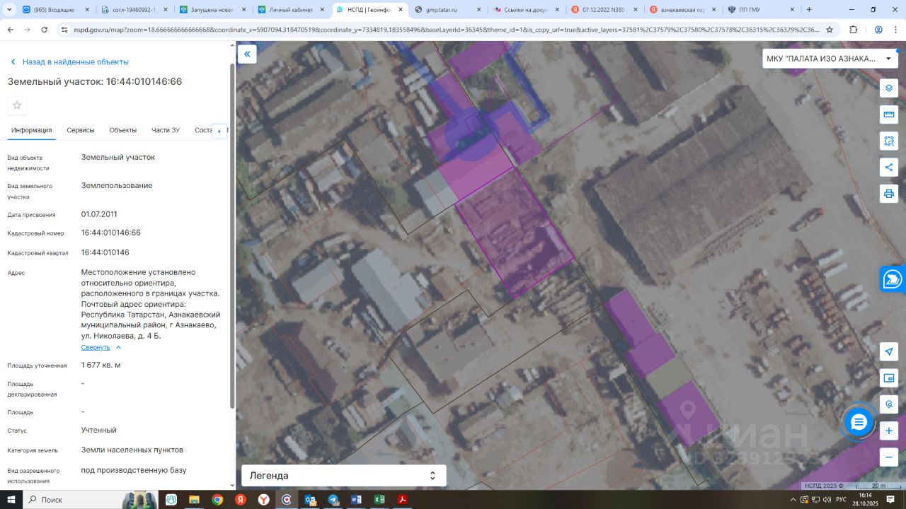 Земельный участок с кадастровым номером 16:44:010146:66, расположенный по адресу: Республика Татарстан, Азнакаевский муниципальный район, г Азнакаево, ул. Николаева, д. 4 Б, площадью 1677 кв.м., из категории земель населенных пунктов, с разрешенным использованием "под производственную базу"