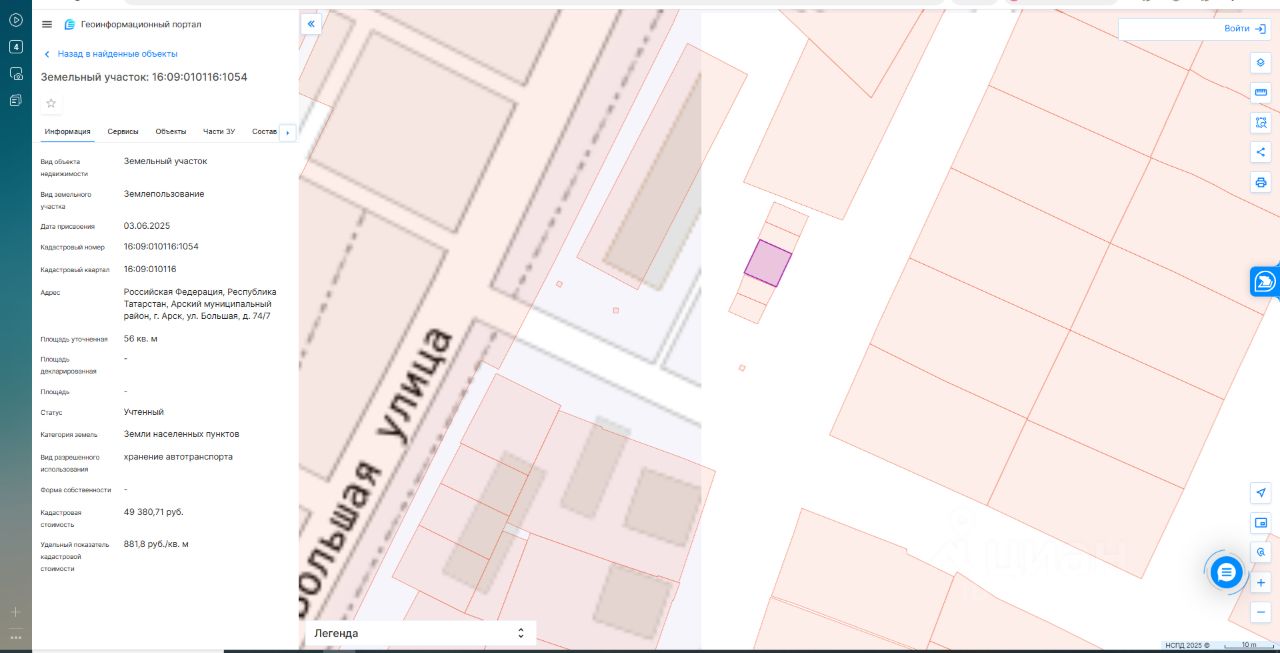Земельный участок, категория земель: земли населенных пунктов, разрешенное использование: хранение автотранспорта, общая площадь 56 кв.м, кадастровый номер 16:09:010116:1054, расположенный по адресу: Российская Федерация, Республика Татарстан, Арский муниципальный район, г.Арск, ул.Большая, д.74/7.