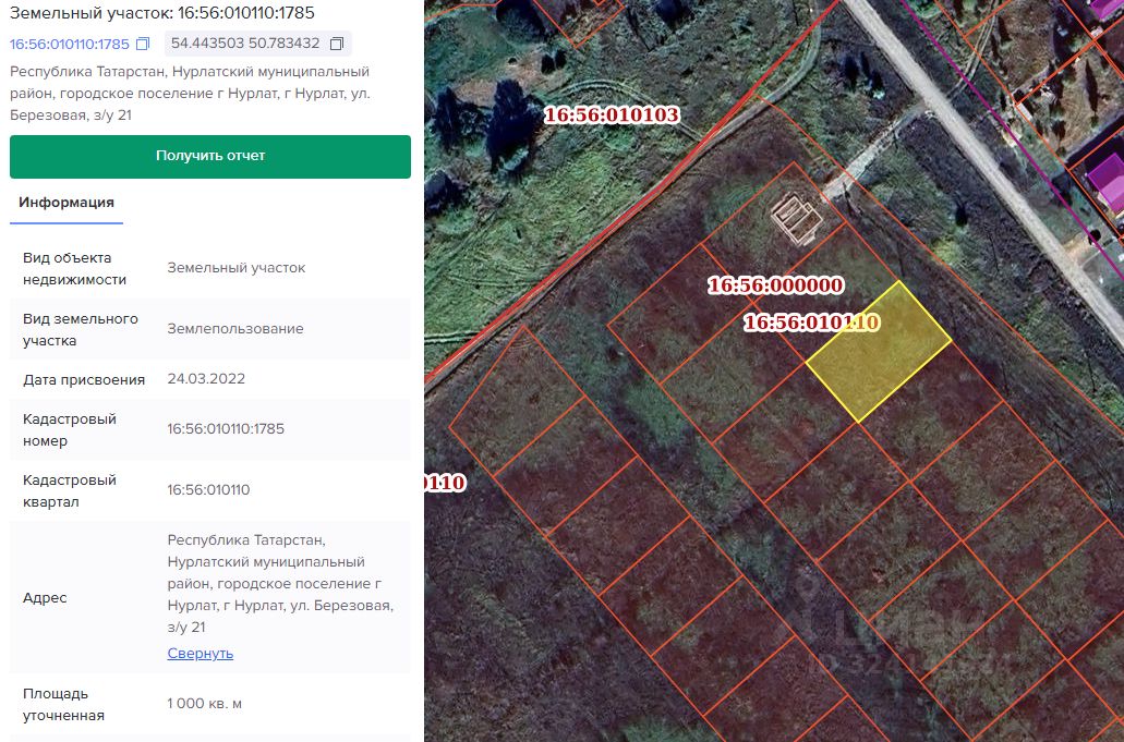 Земельный участок из земель населенных пунктов с кадастровым номером 16:56:010110:1785 площадью 1000 кв.м., расположенного по адресу: Республика Татарстан, Нурлатский муниципальный район, городское поселение г Нурлат, г Нурлат, ул. Березовая, з/у 21, с разрешенным использованием жилая застройка, в аренду.