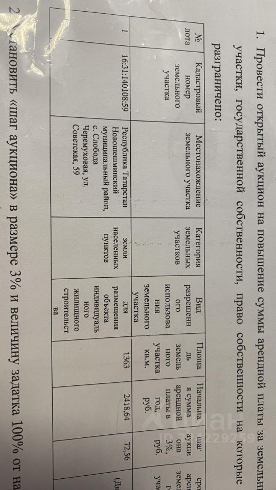 Земельный участок, категория земель: земли населенных пунктов, разрешенное использование: для размещения объекта индивидуального жилищного строительства, общая площадь 1363 кв.м, кадастровый номер 16:31:140108:59, расположенный по адресу: Республика Татарстан, Новошешминский муниципальный район, с.Слобода Черемуховая, ул. Советская, 59.