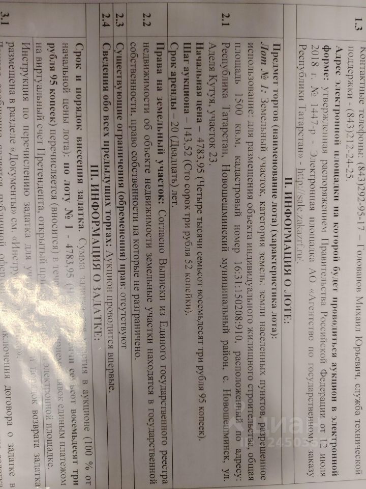 Лот 1: Земельный участок, категория земель: земли населенных пунктов, разрешенное использование: для размещения объекта индивидуального жилищного строительства, общая площадь 1500 кв.м, кадастровый номер 16:31:150208:910, расположенный по адресу: Республика Татарстан, Новошешминский муниципальный район, с. Новошешминск, ул. Аделя Кутуя, участок 23.