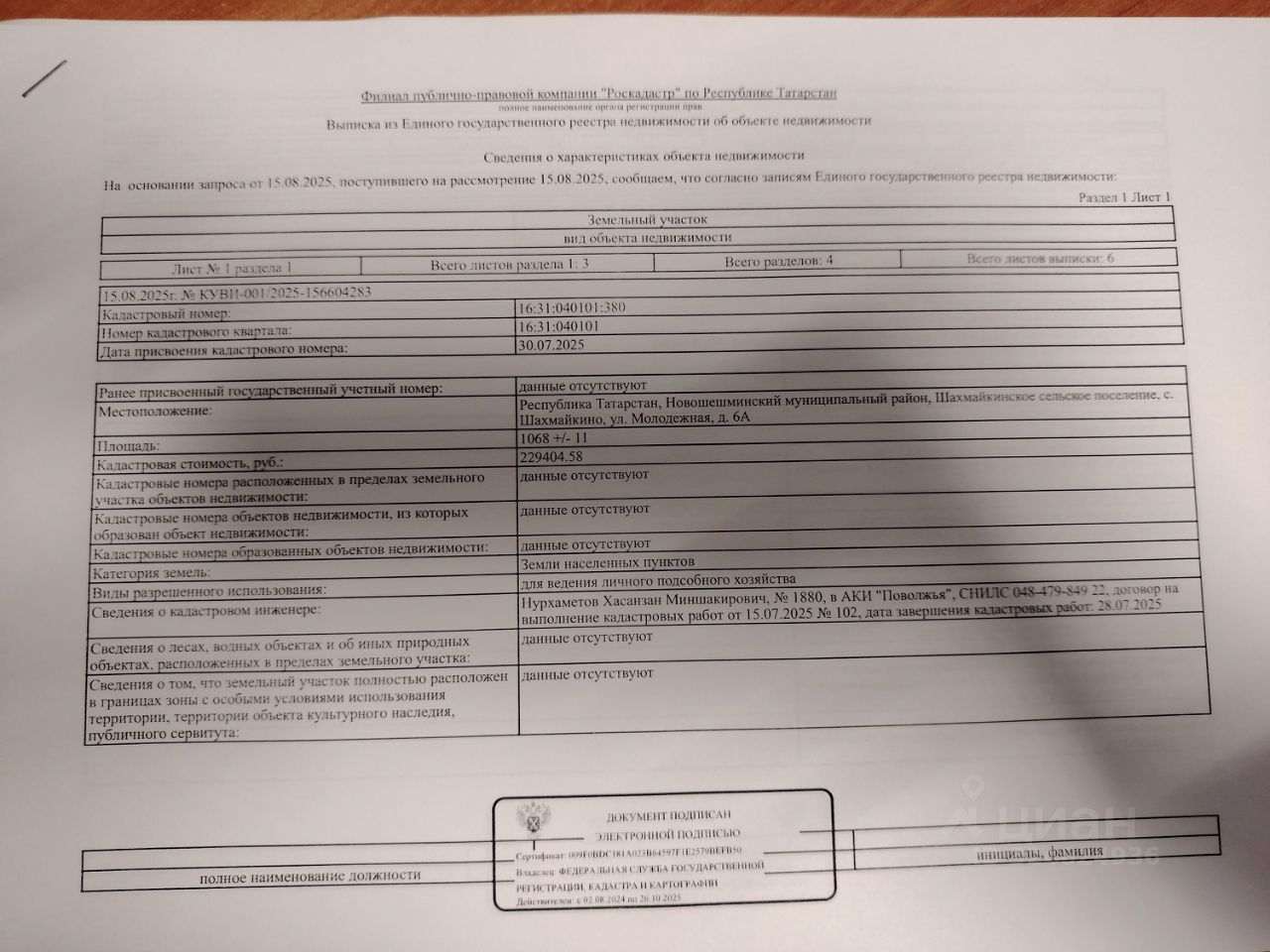 Лот 1: Земельный участок, категория земель: земли населенных пунктов, разрешенное использование: для ведения личного подсобного хозяйства, общая площадь 1068 кв.м, кадастровый номер 16:31:040101:380, расположенный по адресу: Республика Татарстан, Новошешминский муниципальный район, с. Шахмайкино, ул. Молодежная, д.6А.