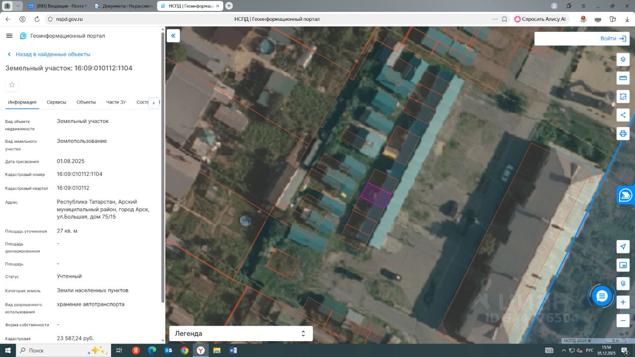Земельный участок, категория земель: земли населенных пунктов, разрешенное использование: хранение автотранспорта, общая площадь 27 кв.м, кадастровый номер 16:09:010112:1104, расположенный по адресу: Российская Федерация, Республика Татарстан, Арский муниципальный район, г.Арск, ул.Большая, д.75/15