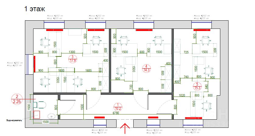 • Площади кабинетов: 17,9 / 15,3 / 14,3 кв.м