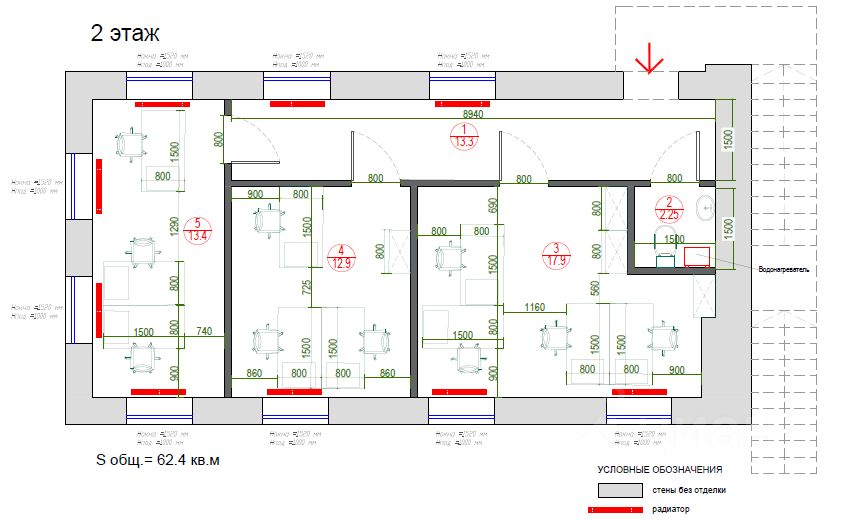 • Площади кабинетов: 17,9 / 13,4 / 12,9 кв.м
