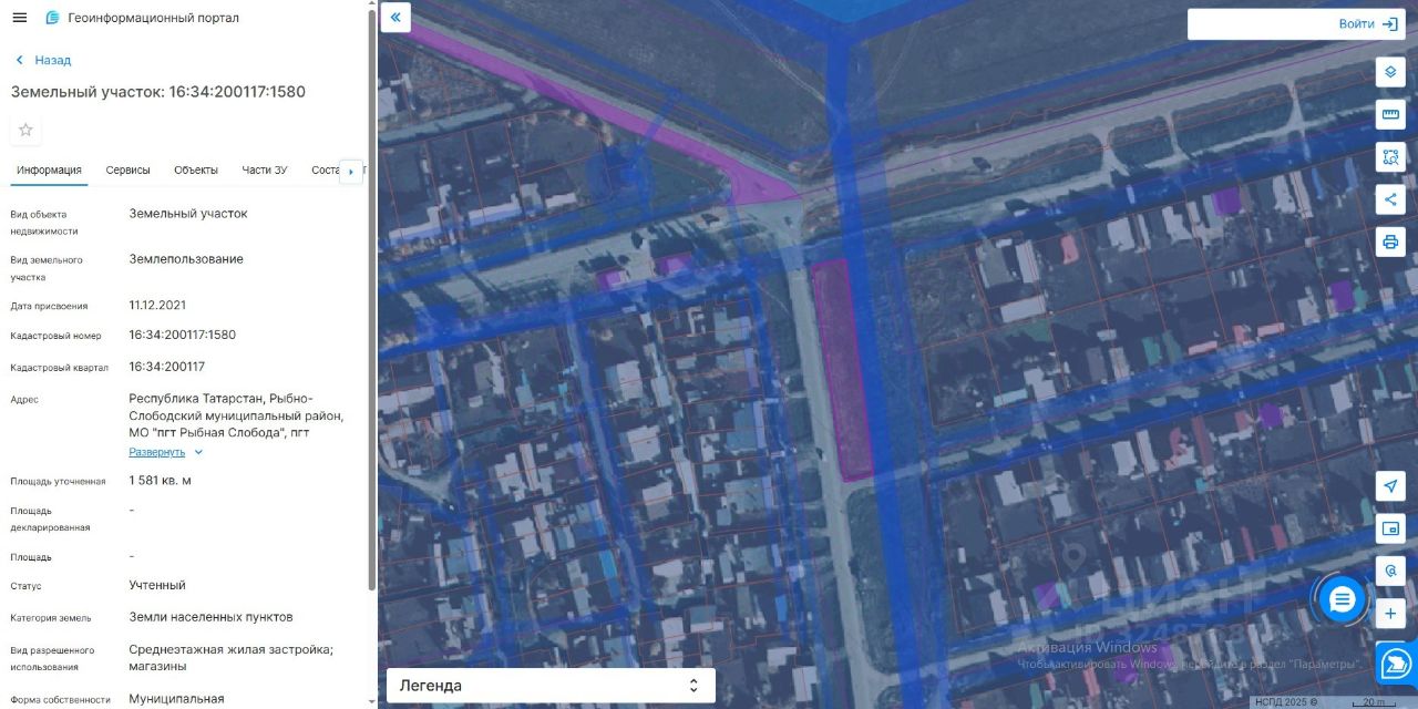 Земельный участок с кадастровым номером 16:34:200117:1580, площадью 1581 кв.м., расположенного по адресу: Республика Татарстан, Рыбно-Слободский муниципальный район, МО "пгт Рыбная Слобода", пгт Рыбная Слобода, ул. К.Сибгатуллина, з/у 1А; категория: Земли населенных пунктов, вид разрешенного использования: Средне этажная жилая застройка; магазины.