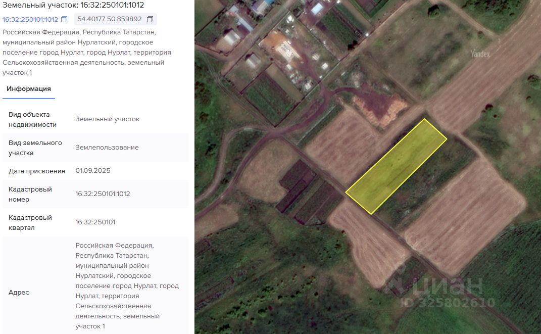 Земельный участок из земель населенных пунктов с кадастровым номером 16:32:250101:1012 площадью 4092 кв.м., расположенного по адресу: Российская Федерация, Республика Татарстан, муниципальный район Нурлатский, городское поселение город Нурлат, город Нурлат, территория Сельскохозяйственная деятельность, земельный участок 1, с разрешенным использованием для ведения личного подсобного хозяйства, в аренду.