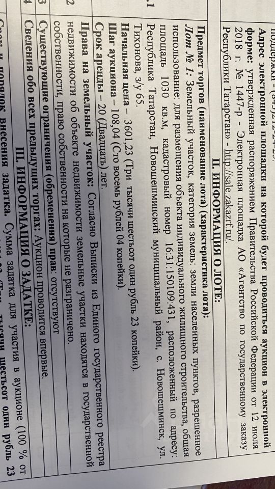 Лот 1: Земельный участок, категория земель: земли населенных пунктов, разрешенное использование: для размещения объекта индивидуального жилищного строительства, общая площадь 1030 кв.м, кадастровый номер 16:31:150109:431, расположенный по адресу: Республика Татарстан, Новошешминский муниципальный район, с. Новошешминск, ул. Тихонова, з/у 65.
