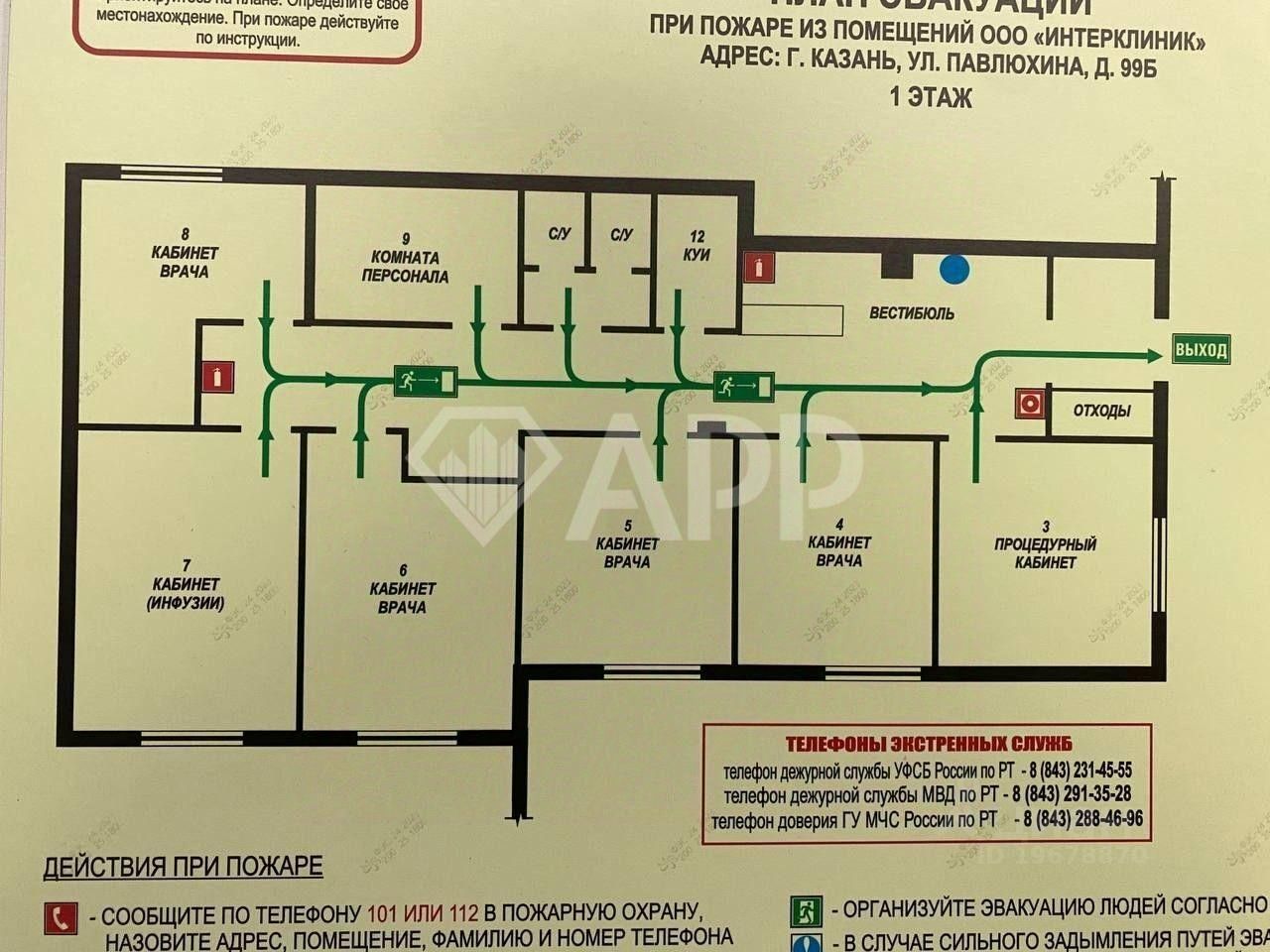 6 кабинетов с окнами для приёма пациентов, комната приема пищи, раздельный санузел.