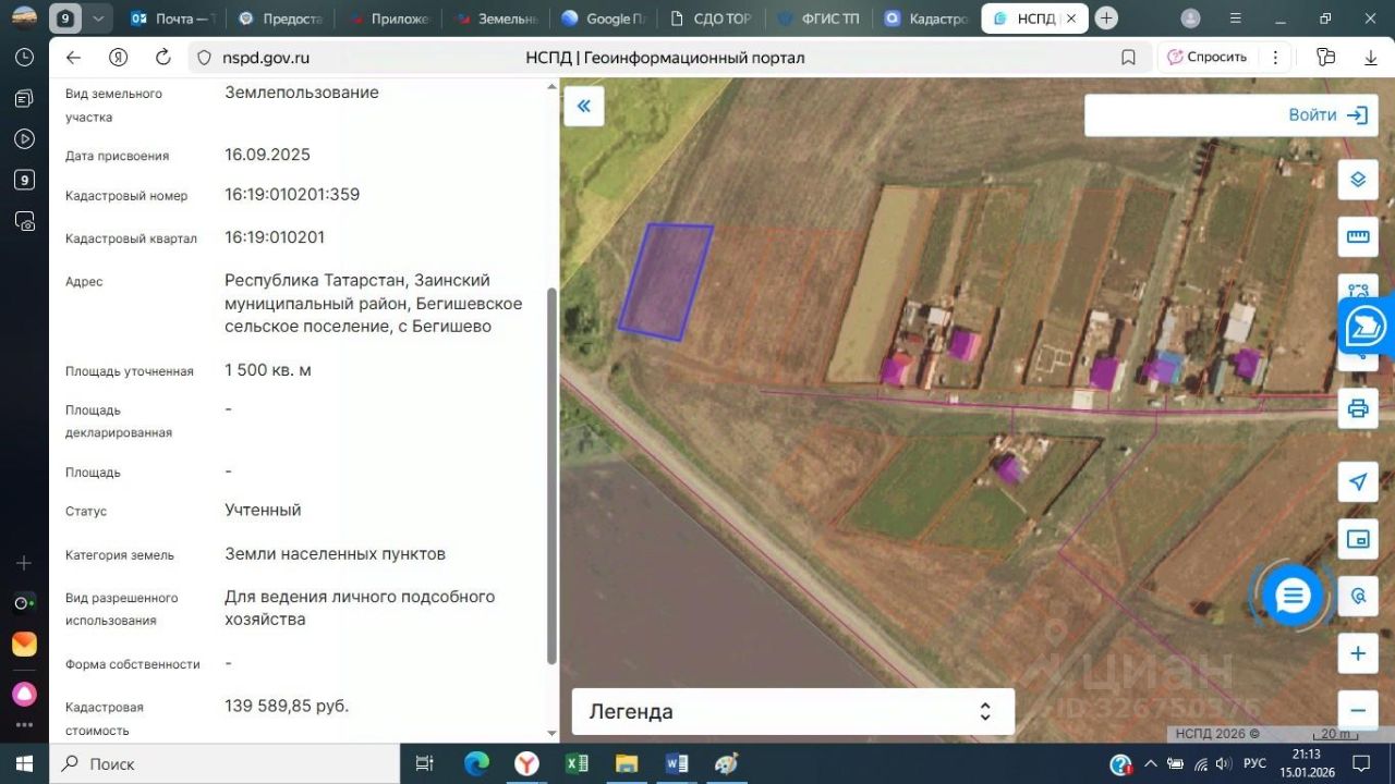 Земельный участок, категория земель: земли населенных пунктов, разрешенное использование: для ведения личного подсобного хозяйства, общая площадь 1500 кв.м., кадастровый номер 16:19:010201:359, расположенный по адресу: Республика Татарстан, Заинский муниципальный район, Бегишевское сельское поселение, с. Бегишево.