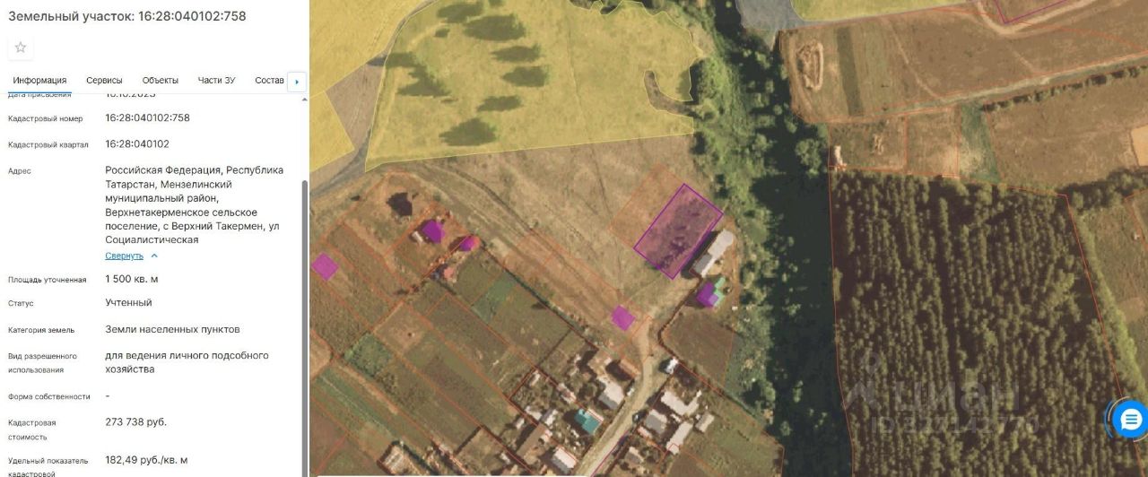земельный участок из земель населенных пунктов площадью 1500 кв.м. с кадастровым номером 16:28:040102:758, с разрешенным использованием "Для ведения личного подсобного хозяйства", расположенный по адресу: РТ, Мензелинский муниципальный район, Верхнетакерменское сельское поселение, с. Верхний Такермен, ул. Социалистическая