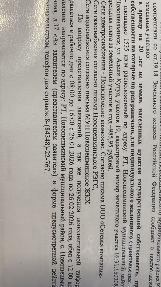 Лот 1: Земельный участок, категория земель: земли населенных пунктов, разрешенное использование: для размещения объекта индивидуального жилищного строительства, общая площадь 1535 кв.м, кадастровый номер 16:31:150208:918, расположенный по адресу: Республика Татарстан, Новошешминский муниципальный район, с. Новошешминск, ул. Аделя Кутуя, участок 19.