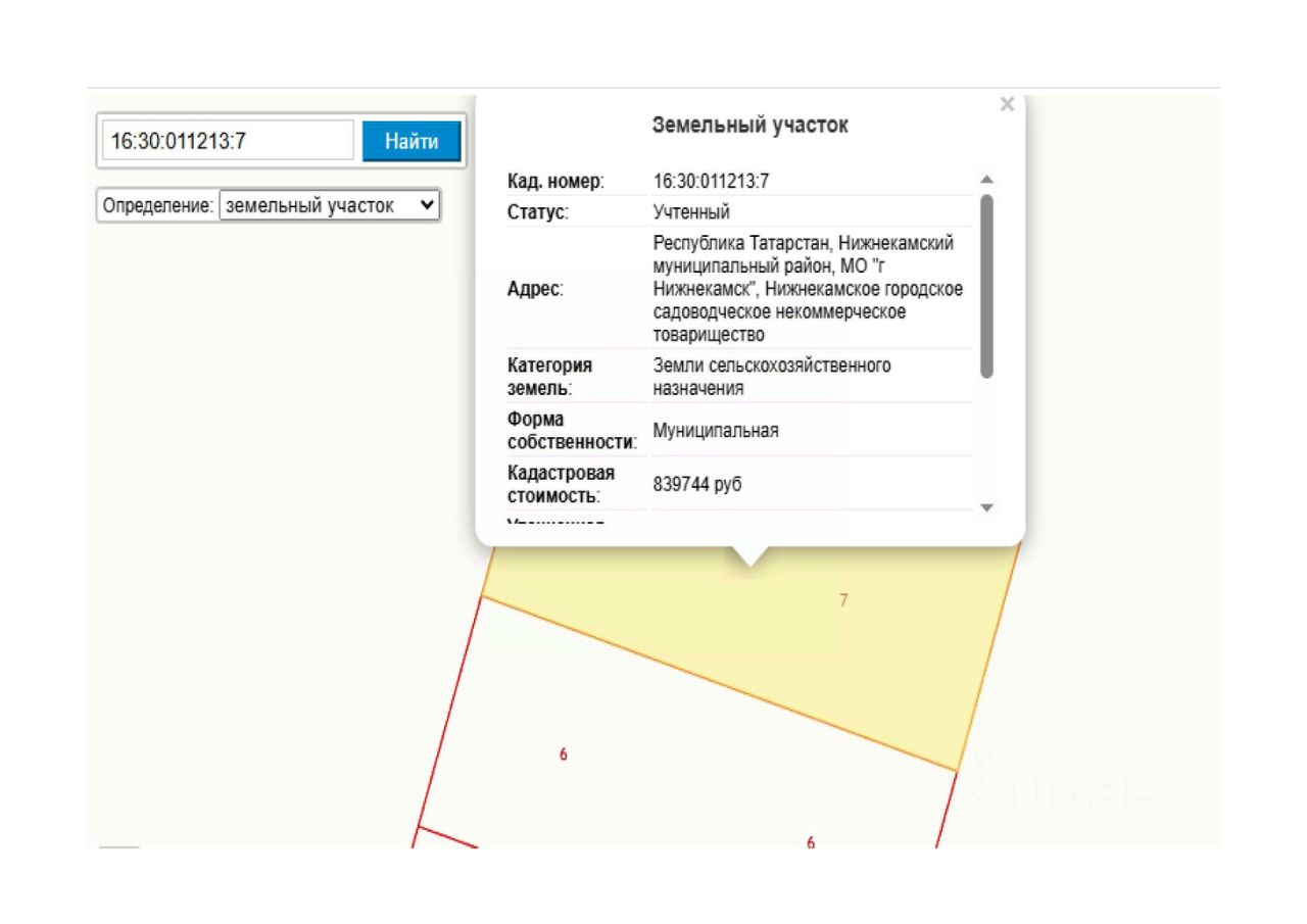 Земельный участок, площадью 1499 кв.м., К 16:30:011213:7, расположенный по адресу: Российская Федерация, Республика Татарстан, Нижнекамский муниципальный район, МО "г.Нижнекамск", Нижнекамское городское садоводческое некоммерческое товарищество; категория земель земли сельскохозяйственного назначения; с видом разрешённого использования для ведения садоводства.