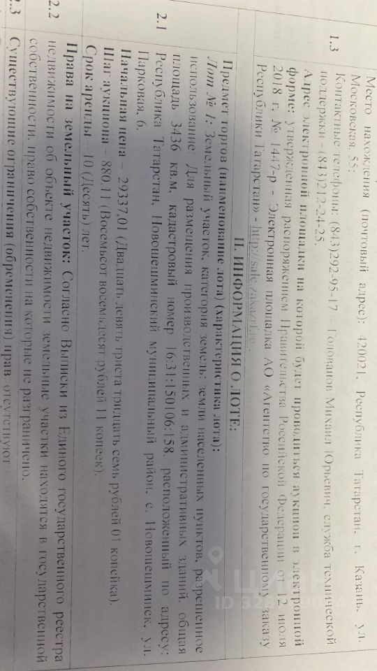 Лот 1: Земельный участок, категория земель: земли населенных пунктов, разрешенное использование: Для размещения производственных и административных зданий, общая площадь 3436 кв.м, кадастровый номер 16:31:150106:158, расположенный по адресу: Республика Татарстан, Новошешминский муниципальный район, с. Новошешминск, ул. Парковая, 6.