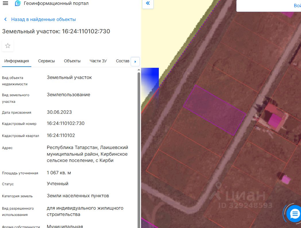 Земельный участок с кадастровым номером 16:24:110102:730, вид разрешенного использования - для индивидуального жилищного строительства из земель населенных пунктов, общей площадью 1067 кв.м., расположенный по адресу: Республика Татарстан, Лаишевский муниципальный район, Кирбинское сельское поселение, с Кирби