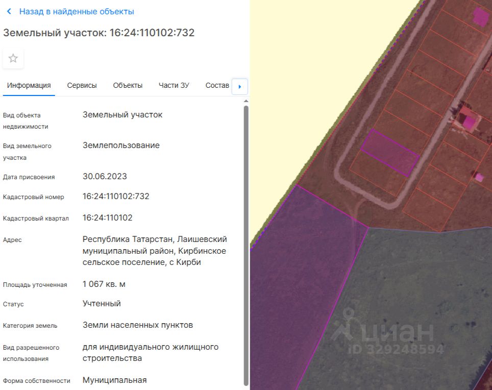 Земельный участок с кадастровым номером 16:24:110102:732, вид разрешенного использования - для индивидуального жилищного строительства из земель населенных пунктов, общей площадью 1067 кв.м., расположенный по адресу: Республика Татарстан, Лаишевский муниципальный район, Кирбинское сельское поселение, с Кирби.