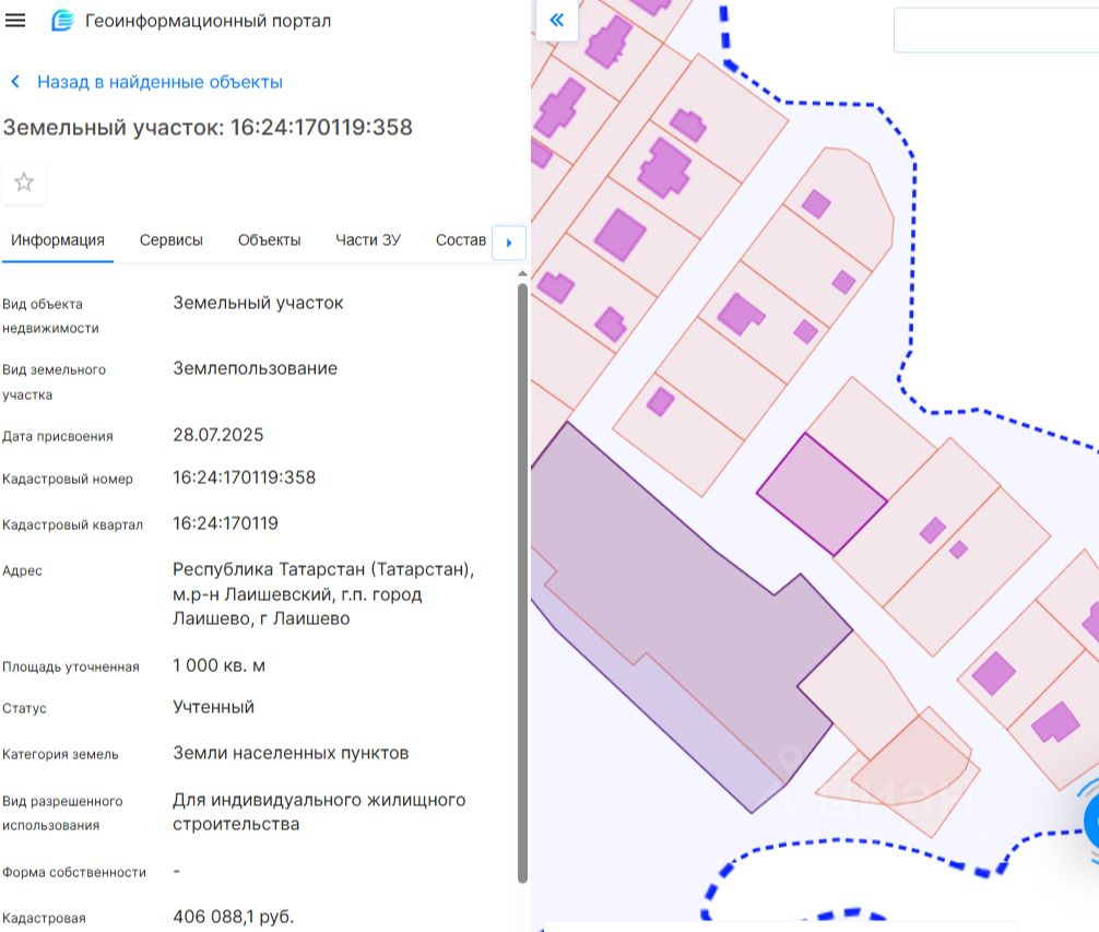 Земельный участок с кадастровым номером 16:24:170119:358, вид разрешенного использования для индивидуального жилищного строительства из земель населенных пунктов, общей площадью 1000 кв.м., расположенный по адресу: Республика Татарстан, Лаишевский муниципальный район, городское поселение город Лаишево, г. Лаишево