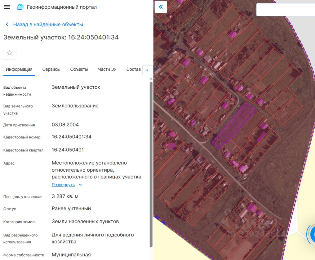 Земельный участок с кадастровым номером 16:24:050401:34, вид разрешенного использования для ведения личного подсобного хозяйства из земель населенных пунктов, общей площадью 3287 кв.м., расположенный по адресу: Республика Татарстан, Лаишевский муниципальный район, Никольское сельское поселение, с Кунтечи, ул. Центральная, 73