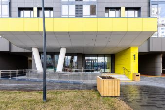 Во дворе дома расположились экологичная детская площадка, зона для занятий спортом, скамейки, дорожки.
