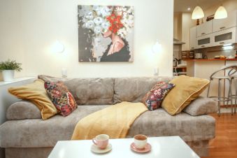 Для двуспальной кровати выделена небольшая изолированная спальная комната. Раскладной двуспальный диван находится в гостиной и будет удобен для двух детей или взрослой пары.