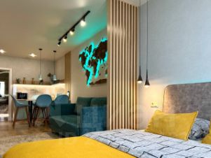Необычная дизайнерская студия с захватывающим видом с 20го этажа на центр Казани и озеро Кабан. Центральным украшением студии является карта мира с цветными подсветками, благодаря которой вы сами задаете тон своего настроения!