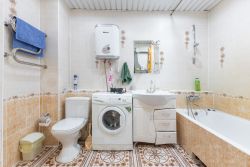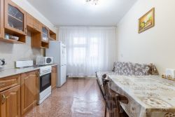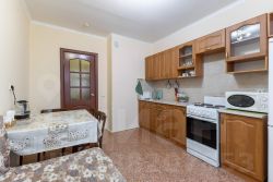В квартире 5 спальных мест одно и двухместные кровати, мягкий диван. На кухне имеется всё необходимое для приготовления пищи: электрический чайник, микроволновая печь, холодильник, плита, мультиварка.