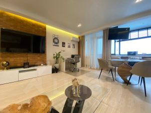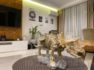 Удобная рабочая зона с офисным креслом и письменными принадлежностями, оборудованная кухня с посудомоечной машиной, дизайнерский обеденный стол. Комфортная зона отдыха с домашним кинотеатром на два телевизора. Уютный балкон. Расслабляющее, романтичное джакузи, вместительная гардеробная и зеркала.