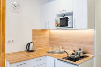 кухня со встроенной сенсорной варочной панелью и всей необходимой посудой;