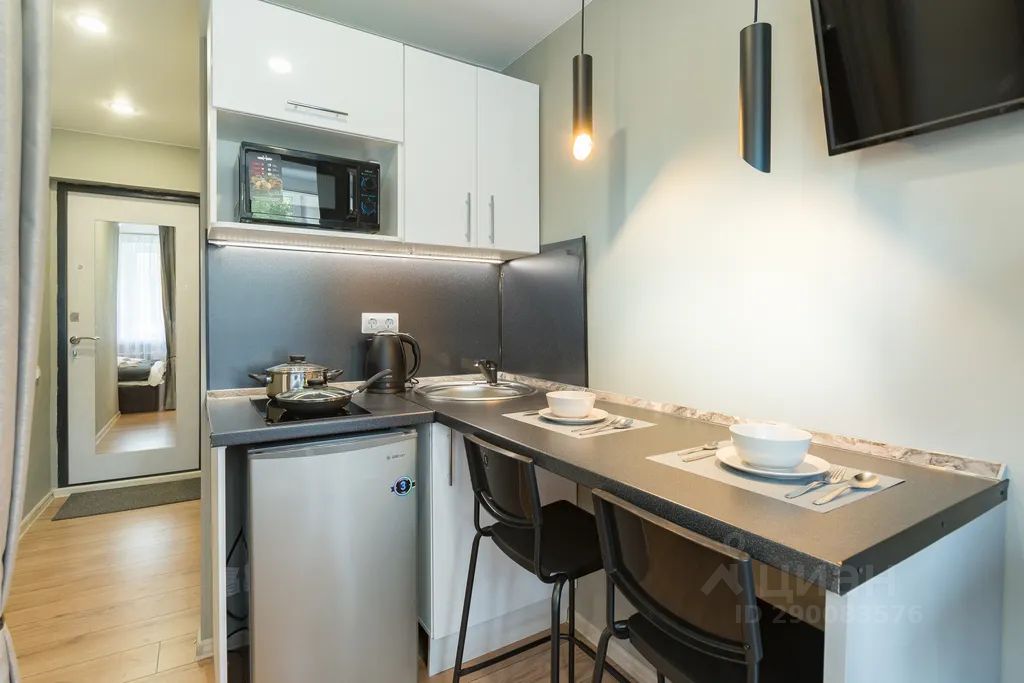 кухня со встроенной сенсорной варочной панелью и всей необходимой посудой;