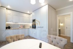 ПРО КВАРТИРУ: Стильный кухонный гарнитур, оснащён варочной панелью, вытяжкой, духовым шкафом, микроволновой печью, чайником холодильником, а также имеется весьма вместительная гардеробная комната;