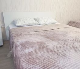 Большая двуспальная кровать с хлопковым постельным бельём очень приятным к телу.