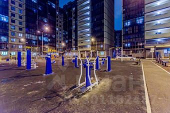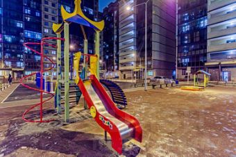 Во дворе закрытым от автотранспорта: детская игровая зона и фитнес тренажёры.